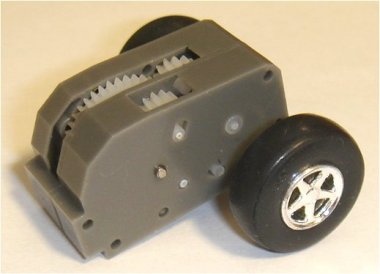 ![]() どんな構造になっているのか 分解したくなっちゃうよね? 6本のねじをはずすとモーター カバーに収まっていた! タイヤはプラ製で後輪の外側 のみゴムがはめられている。 |